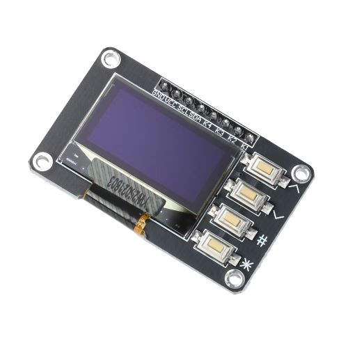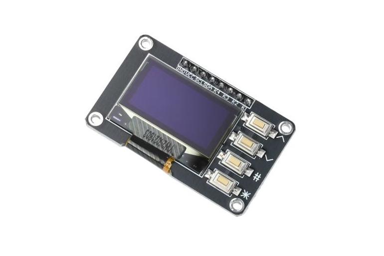 Display OLED da 0,96 pollici bianco con interfaccia I2C combinato con quattro pulsanti, display e pulsanti non sono correlati ma sono posizionati sulla stessa scheda per formare un modulo integrato, sui pin a bordo scheda sono disponibili i segnali necessari per il controllo display e quelle dei due pulsanti.