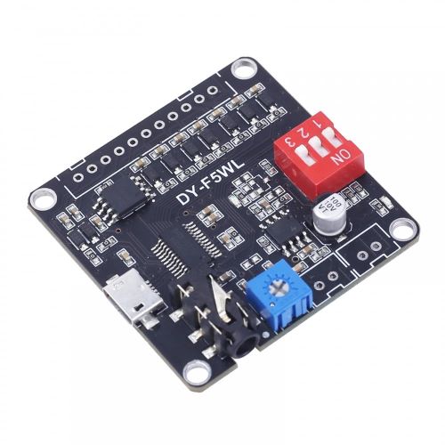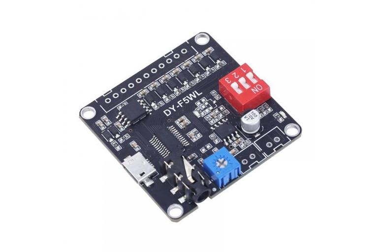 Il Riproduttore Audio DY-F5WL è un modulo di riproduzione vocale mono che supporta i formati di decodifica MP3 e WAV ed è in grado di riprodurre 9 brani selezionabili tramite 9 segnali di ingresso.