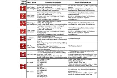 Il modulo dispone di una memoria flash integrata da 32 Mbit (4 MByte), di una uscita audio con una potenza di 5W su 4 ohm e può essere alimentato con una tensione compresa tra 3,7Vcc e 5Vcc, il connettore micro USB presente sulla scheda permette il deownload dei file audio utilizzando un PC mentre il triplo dip-swich permette di selezionare le varie modalità di lavoro.