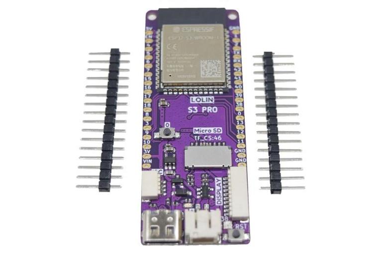 La Wemos Lolin S3 Pro è basata sul modulo ESP32-S3-WROOM-1, è dotata di flash QSPI da 16 MB, SPRAM da 8 MB, una porta USB Type-C, una porta UART, una porta Lolin I2C, un connettore per micro SD, un connettore per display LCD e del pulsante di ripri